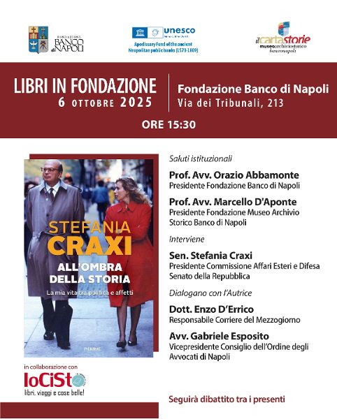 Lunedì 6 ottobre alle 15:30 a Palazzo Ricca, sede della Fondazione Banco Napoli (via dei Tribunali, 213) è in programma la presentazione del libro di Stefania Craxi "All'ombra della storia, La mia vita tra affetti e politica", memoriale di una figlia che racchiude l'eredità di un pensiero e di una cultura politica. Partecipano Orazio Abbamonte Presidente della Fondazione, Marcello D'Aponte Presidente Fondazione Museo Archivio Storico Banco di Napoli, Enzo D'Errico Responsabile Corriere del Mezzogiorno, Gabriele Esposito Vicepresidente Consiglio dell'Ordine degli Avvocati di Napoli, in collaborazione con la libreria loCiSto. «Questo volume nasce da un moto dell'animo. Racconta un pezzo della mia storia - commenta Stefania - il mio Craxi, un padre difficile e straordinario, e, vagando tra i ricordi, narra le vicende della nostra famiglia, una famiglia allargata a una piccola, grande comunità politica e di amici che per anni ha condiviso tutto.» Per la prima volta, la senatrice, figlia di Bettino, decide di raccontare una storia politica di cui va fieramente orgogliosa. Nelle sue riflessioni non c'è solo il ricordo affettuoso del politico esuberante e sognatore, ostinato e tenace che era suo padre, ma il racconto di un intero Paese in grande trasformazione, pieno di energie e rancori mai sopiti. Uomini e donne, protagonisti e comparse di un'epoca che non tornerà; i pochi che le sono stati vicino e i molti che si sono girati dall'altra parte nei periodi più bui; pagine straordinarie, e a volte dolorose, della storia recente italiana. "La mia prima vita, che racconto in questo libro - spiega - non contemplava il palcoscenico, ma semmai il dietro le quinte, lo stare fuori dallo schermo, mai davanti. E, soprattutto, non prevedeva, neanche per sogno, la politica come impegno quotidiano. Ma nessuno ci chiede cosa vogliamo: la volontà si scontra con il senso del dovere, del dover agire e del dover fare, del dover dire e del dover esserci. È questo l'insegnamento che ho tratto vivendo all'ombra della Storia. Non ne ho fatto parte, forse solo in determinati frangenti, in alcuni casi comici e in altri tragici, ma sono mio malgrado una testimone. E oggi, raggiunta l'età della maturità, l'età in cui si riflette e si guarda al passato, vedo scorrere davanti ai miei occhi dei fotogrammi, che mi fanno capire quanto sia distante quel tempo passato e quanto, per molti versi, quel tempo sembra non passare".