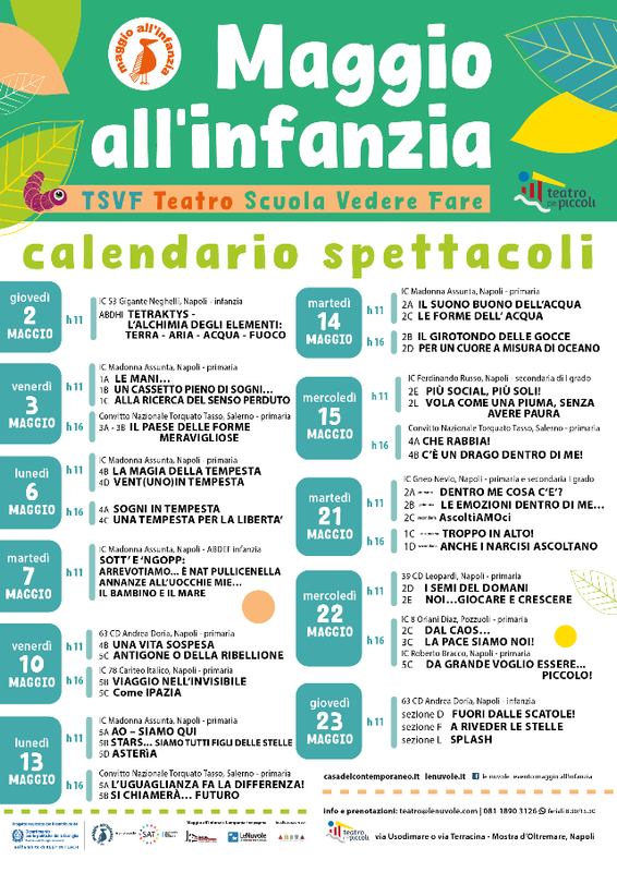 E' partita ieri, giovedì 2 maggio per proseguire fino al 23 maggio, la 9a edizione del Maggio all'infanzia Campania: la rassegna di teatro fatto dalla scuola in programma al Teatro dei Piccoli di Napoli. Per oltre 3 settimane la manifestazione porterà in scena di fronte ad un pubblico di famiglie e scuole i 45 spettacoli inediti realizzati dai 900 studenti di 10 istituti scolastici tra Napoli, Pozzuoli e Salerno nell'ambito del pluripremiato progetto TEATRO SCUOLA VEDERE FARE (TSVF) ideato da Casa del Contemporaneo con Le Nuvole di Napoli e la collaborazione di AGITA.