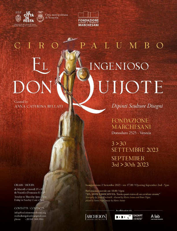 Negli spazi espositivi della Fondazione Giorgio e Armanda Marchesani, a Venezia, si terrà, dal 3 al 30 settembre 2023, inserita nel circuito della Biennale di Venezia 2023, la mostra di Ciro Palumbo, El ingenioso Don Quijote, a cura di Anna Caterina Bellati. Dipinti, sculture e disegni ispirati al capolavoro di Miguel Cervantes e alla reinterpretazione del cavaliere errante più celebre della Storia.