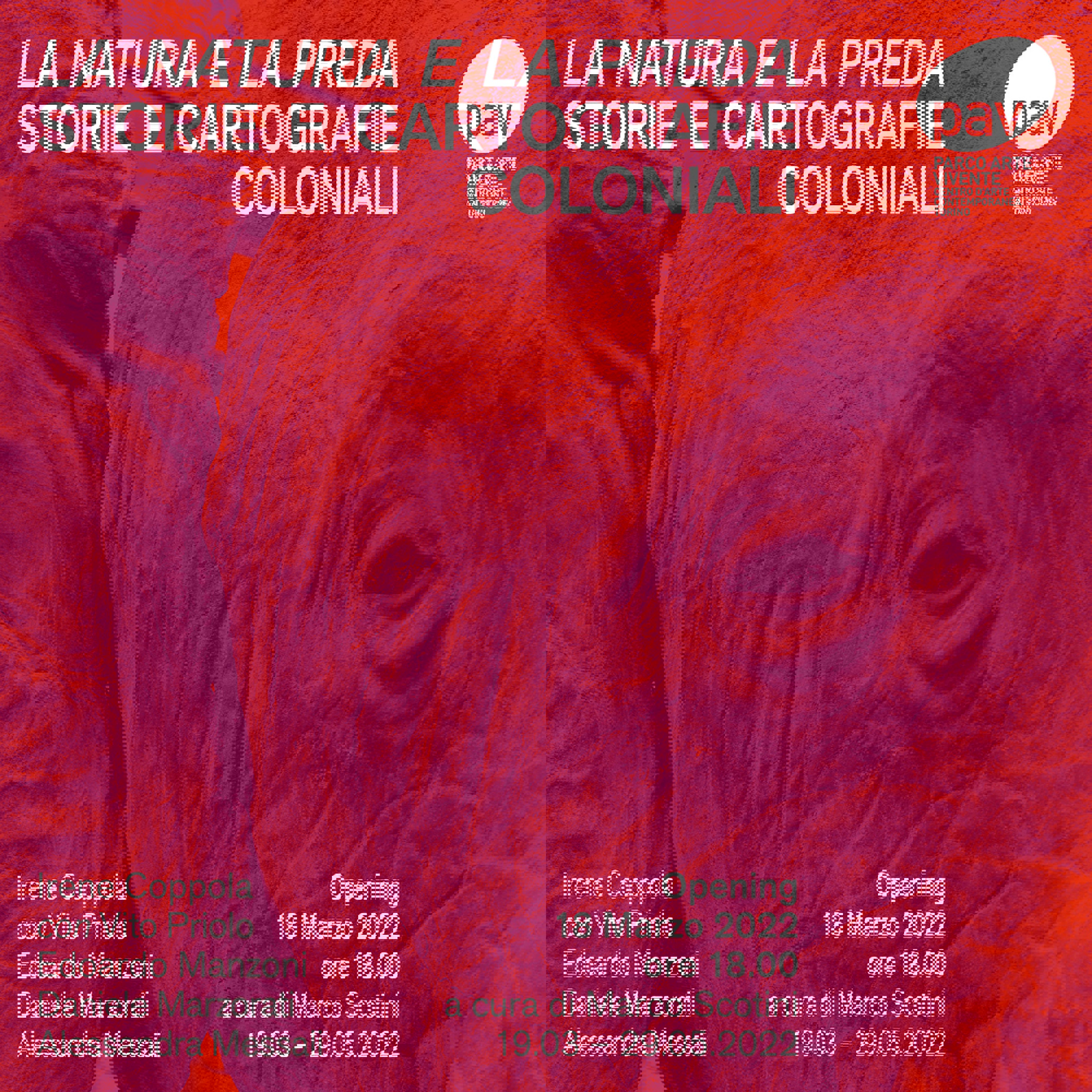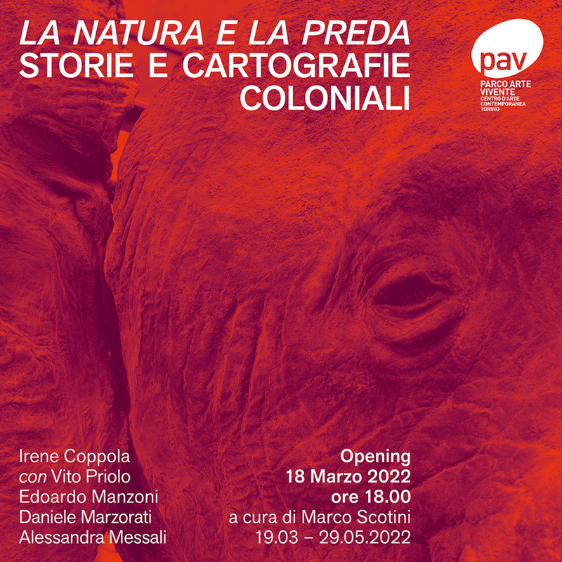 Venerdì 18 marzo 2022, il PAV Parco Arte Vivente presenta la mostra collettiva La Natura e la Preda, che affronta il tema della memoria coloniale attraverso i lavori di alcuni giovani artisti italiani: Irene Coppola con Vito Priolo, Edoardo Manzoni, Daniele Marzorati e Alessandra Messali.