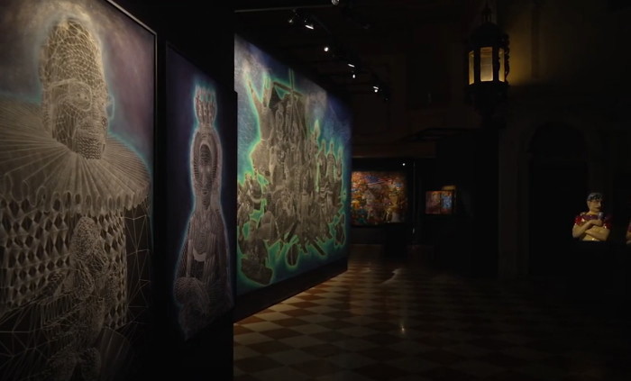 Una mostra che, come spiegato dalla curatrice Dorothy Kosinski, è essa stessa opera d’arte totale, non semplice assemblaggio di video, dipinti, sculture in ceramica, opere VR e ologrammi, ma orchestrazione di opere d’arte multi-materiche, in dialogo con gli ambienti storici del palazzo, per dare vita a un evento immersivo, intimo ed emotivo che conduce per mano lo spettatore nel mondo distopico, grottesco e visionario di Federico Solmi.