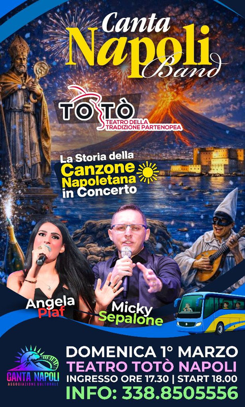 Micky Sepalone e Angela Piaf con la loro band tornano a riscaldare la città di Napoli. Dopo il memorabile sold out al Maschio Angioino (estate 2024) e gli strepitosi show all’interno della prestigiosa rassegna ‘L'Estate a Napoli’ (dal 2021 al 2024), la Canta Napoli Band riporta nella terra di Partenope la storia della canzone partenopea. L’appuntamento è per domenica 1 marzo alle ore 18.00 al Teatro Totò.