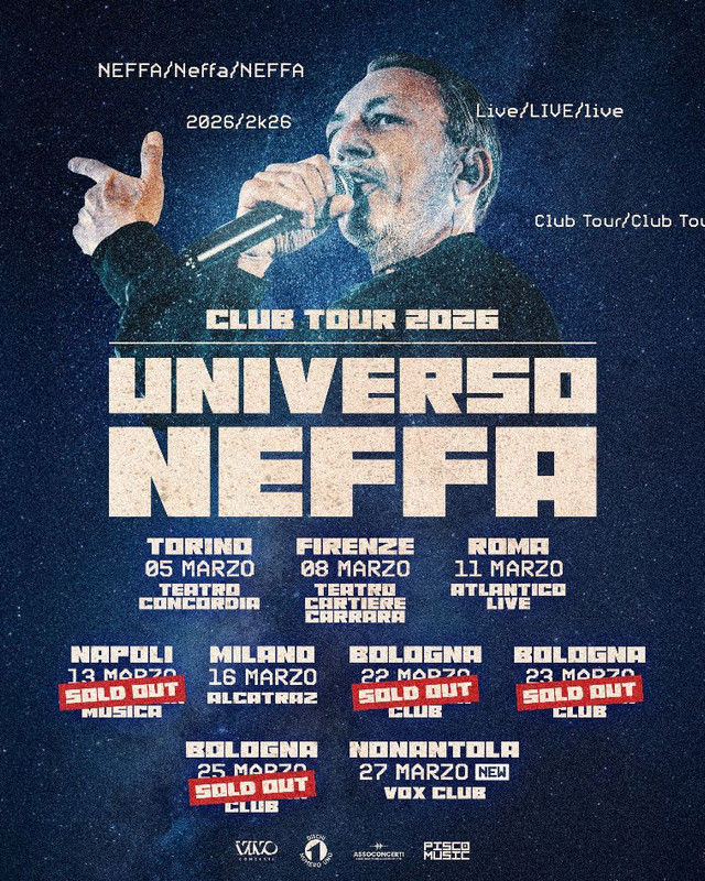 Neffa torna dal vivo con il CLUB TOUR 2026 – UNIVERSO NEFFA, la nuova tournée prodotta da Vivo Concerti che attraverserà l’Italia per tutto il mese di marzo e farà tappa a Napoli @ Casa della Musica il 13 marzo 2026 (SOLD OUT).