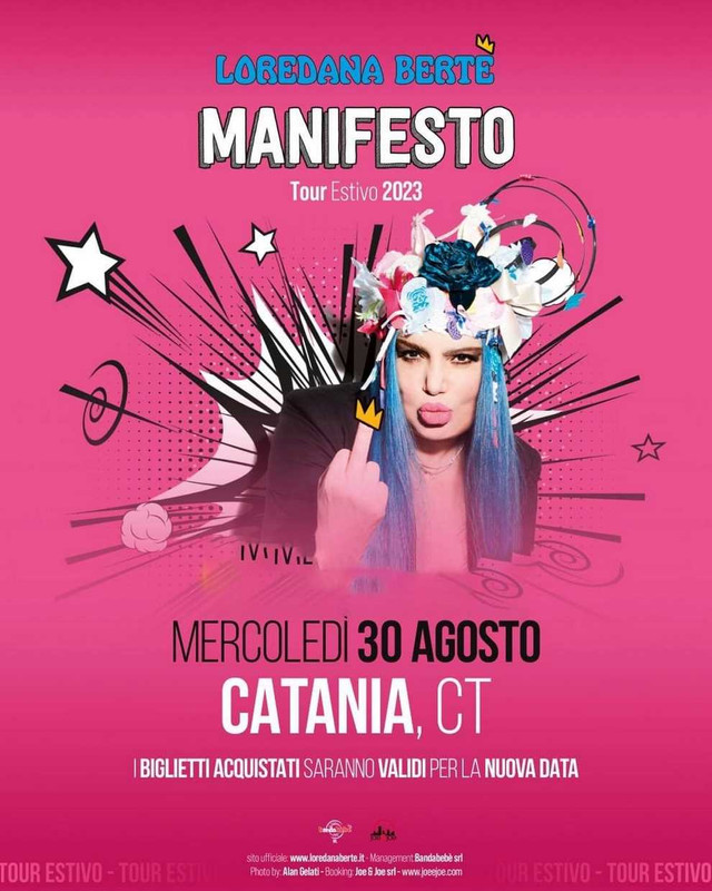 L’unico appuntamento siciliano con la Bertè nazionale è mercoledì 30 agosto ore 21.30 alla Villa Bellini, nell’ambito della rassegna musicale Catania Summer fest. L’evento è promosso e curato da Arena Eventi Communication.