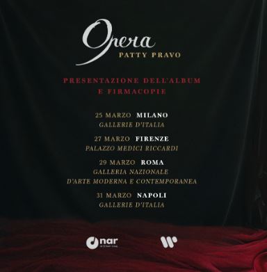 Patty Pravo sarà a NAPOLI per presentare il nuovo album OPERA (Nar International – Ada/Warner Music Italy). L'incontro si terrà martedì 31 marzo a GALLERIE D'ITALIA, in via Toledo 177.