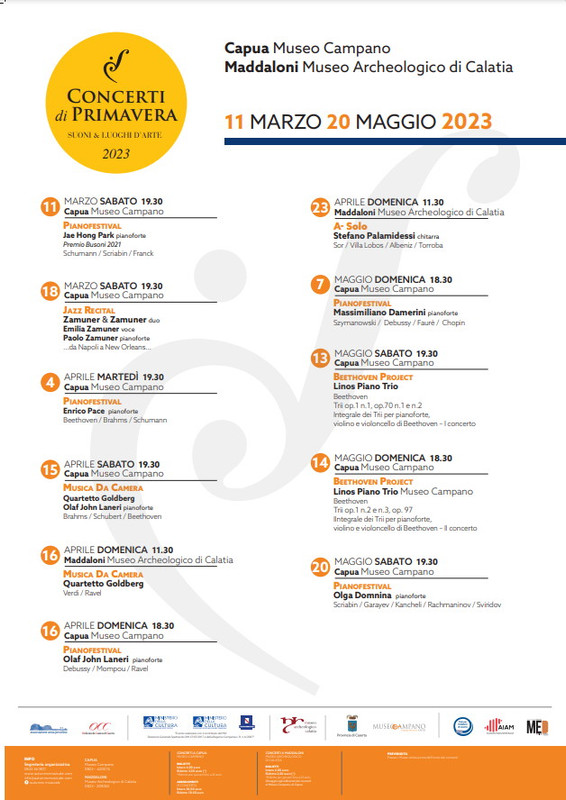 Tornano i Concerti di Primavera dell’associazione “Anna Jervolino”. Undici imperdibili appuntamenti da dall’11 marzo al 20 maggio 2023 tra il Museo Campano di Capua e il Museo archeologico di Calatia di Maddaloni.