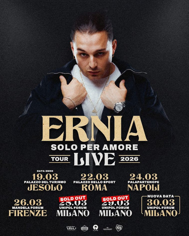 Dopo le tappe a Jesolo e Roma, il “SOLO PER AMORE Tour Live 2026” proseguirà martedì 24 marzo 2026 al Palapartenope di Napoli. Successivamente continuerà con la tappa a Firenze e con un triplo appuntamento a Milano e sarà l’occasione per portare finalmente live tutte le più grandi hit dell’artista e le nuovissime canzoni presenti in “Per Soldi e Per Amore”, il nuovo album di Ernia.