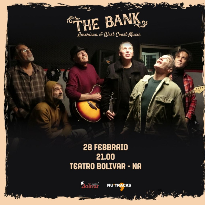 Venerdì 28 febbraio 2025, alle ore 21.00, sul palco del Teatro Bolivar (Via Bartolomeo Caracciolo, 30), diretto da Nu’Tracks, tornano i “THE BANK – American & West Coast Music”, band che custodisce la memoria del movimento musicale, creativo e artistico nato negli anni ’70 fatto di blues rock, west coast, country, ballad e tante altre meravigliose visioni di quel periodo storico.
