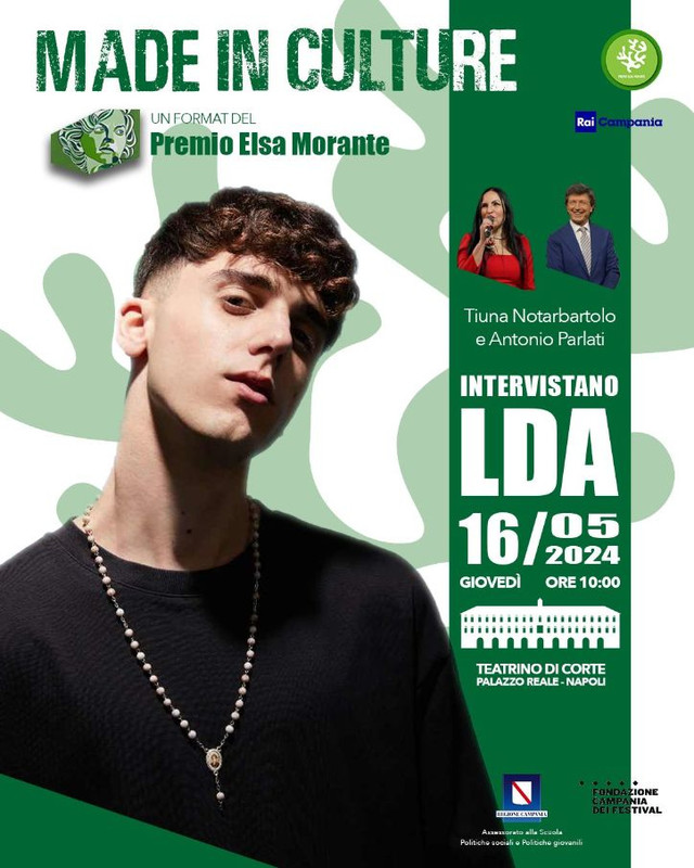 Il 16 maggio alle 10, invece, il premio Elsa Morante vara un nuovo format dal titolo “Made in Culture”, interviste frizzanti e approfondite a personaggi della cultura e dello spettacolo, che poi andranno montate in puntate visibili sui canali del Morante. Il primo ospite, intervistato da Tiuna Notarbartolo, Direttore del Premio e da Antonio Parlati, Direttore di Rai Napoli è il cantante LDA. Made in Culture sarà realizzato a Teatrino di Corte di Palazzo Reale di Napoli, all’interno degli appuntamenti di “Orientalife”, in collaborazione con l’Assessorato alla Scuola, alle Politiche Sociali e alle Politiche Giovanili e con la Fondazione Campania dei Festival.