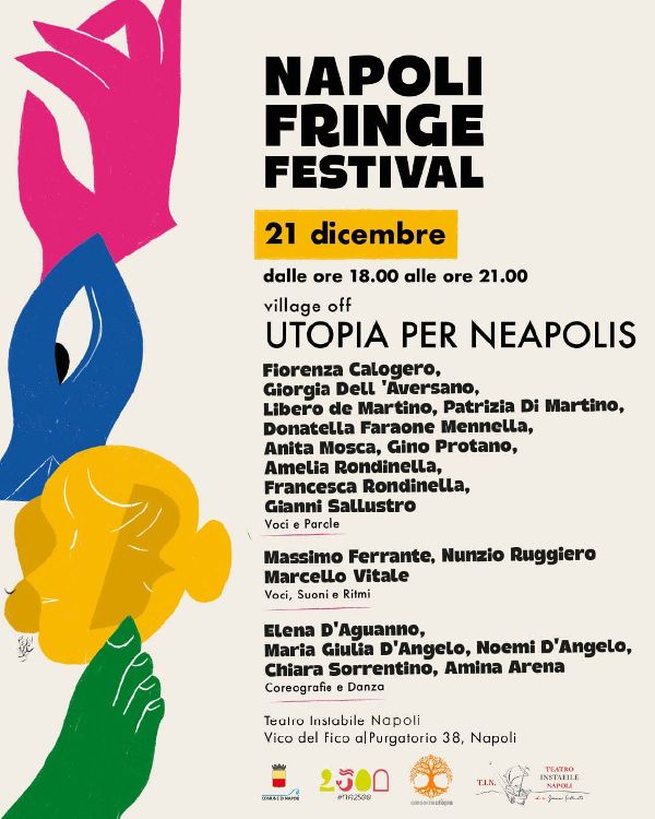 Napoli si racconta e si reinventa attraverso il teatro, la musica, la danza e la poesia con Utòpia per Neapolis, progetto artistico prodotto dal Consorzio Utòpia nell’ambito del Napoli Fringe Festival - direzione artistica Laura Valente - in scena il 21 dicembre dalle 18.00 alle 21.00 al TIN - Teatro Instabile Napoli in Vico del Fico al Purgatorio 38, Napoli.