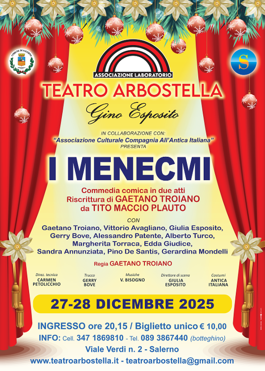Non si ferma durante le feste natalizie la programmazione del Teatro Arbostella di Salerno. Due gli appuntamenti fuori abbonamento per un pubblico che troverà sotto l’albero di Natale un pieno di risate. Il tutto inframmezzato con la ripresa del cartellone prevista già il 3 e 4 gennaio con l’arrivo della Compagnia Avalon di Battipaglia con il capolavoro di Eduardo “Le Voci di Dentro”.