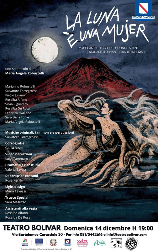 Domenica 14 dicembre 2025, alle ore 19.00 (in replica in matinée lunedì e martedì 15-16 dicembre ore 10.30), al Teatro Bolivar (Via Bartolomeo Caracciolo, 30), diretto da Nu’Tracks, sarà di scena “La luna è una mujer – Voci, canti e leggende di donne, sirene e monacielli di Napoli, tra terra e mare”, un’opera musicale crossmediale di Maria Angela Robustelli, che firma progetto, drammaturgia e regia, prodotto da OTP - obece teatro project, compagnia nazionale, e sostenuto da Scabec e Regione Campania. Nello spettacolo, la musica dal vivo, canzoni e danze popolari, video narrazioni, lingua, cultura napoletana e antica tradizione popolare, contribuiranno a celebrare Napoli a 2500 anni dalla sua nascita, sottolineando la contemporaneità e l’essenza magica senza tempo di cui è fatta.