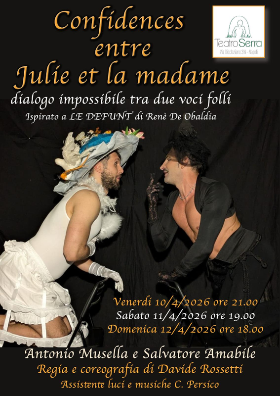 Con “Les confidences entre Julie et la madame” dialogo impossibile a due voci folli, approda al Teatro Serra di Napoli una satira dell’assurdo, liberamente ispirata a “Le défunt” di René de Obaldia. Una produzione “Il nudo dell’anima” per la regia di Davide Rossetti con Salvatore Amabile e Antonio Musella. A Fuorigrotta, in Via Diocleziano 316 dal 10 al 12 aprile (venerdì ore 21:00, sabato ore 19:00, domenica ore 18:00).