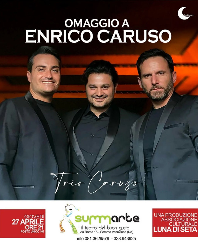 “Omaggio a Caruso” andrà in scena giovedì 27, alle ore 21.00, al Teatro Summarte di Somma Vesuviana (Na). Un evento eccezionale dedicato ad Enrico Caruso, prodotto dall’associazione Luna Di Seta, che vede protagonista il "Trio Caruso”, nato dalla passione per la musica e sorretto da una grande dose di amicizia tra il tenore Marco Ferrante, Alessandro Fortunato, Stefano Sorrentino.