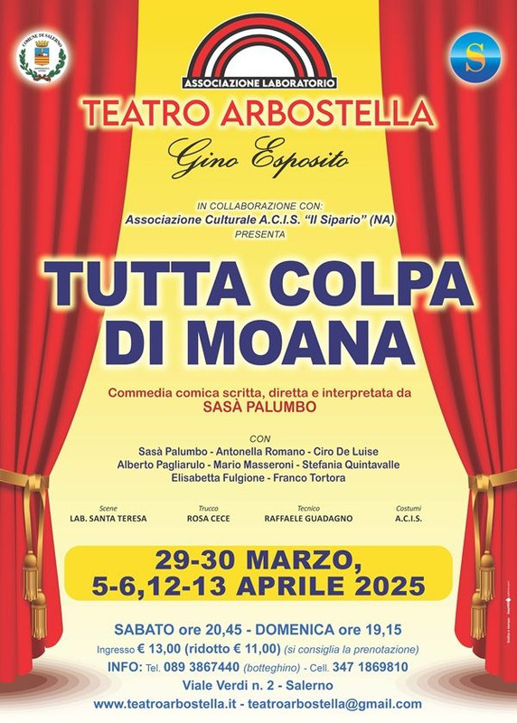 Il Teatro Arbostella Gino Esposito si prepara a un finale di stagione travolgente con il penultimo appuntamento della sua ricca XVII edizione. Sul palco arriva uno degli spettacoli di punta del cartellone firmato Arturo Esposito e Imma Caracciuolo: “Tutta colpa di Moana”, una commedia esilarante scritta, diretta e interpretata da Sasà Palumbo, in scena per l’ultimo weekend di marzo e i primi due di aprile.