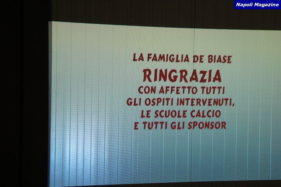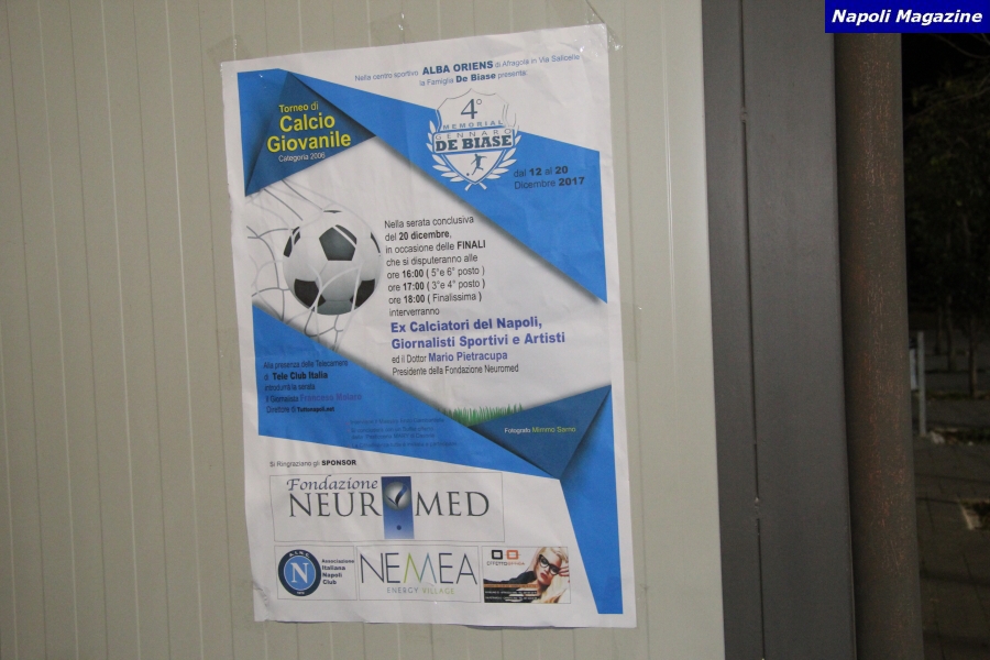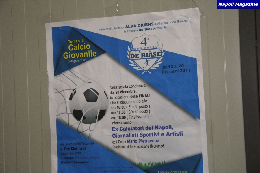 NAPOLI - "Napoli Magazine" ha realizzato 200 Foto in occasione del 4° Memorial Gennaro De Biase, organizzato dal figlio Lello, al Centro Sportivo Alba Oriens. Presenti e premiati gli ex azzurri Gennaro Iezzo, Giovanni Francini e Nicola Mora, unitamente ai giornalisti Antonio Petrazzuolo, Dario Sarnataro e Fabrizio Cappella. Premio per Saverio Passaretti dell'AINC, a condurre la serata come di consueto il giornalista Francesco Molaro.