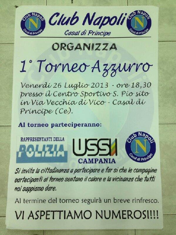 Venerdi' 26 luglio 2013 alle 18:30 presso il Centro Sportivo San Pio, sito in Via Vecchia di Vico, a Casal di Principe (Caserta), avra' luogo il "1° Torneo Azzurro" tra i Rappresentanti della Polizia, l'USSI Campania (che tra le sue fila vedrà i giornalisti Antonio Petrazzuolo, Gianluca Monti, Dino Manganiello, Pasquale Gallo, Antonello Meola) e il Club Napoli Casal di Principe.