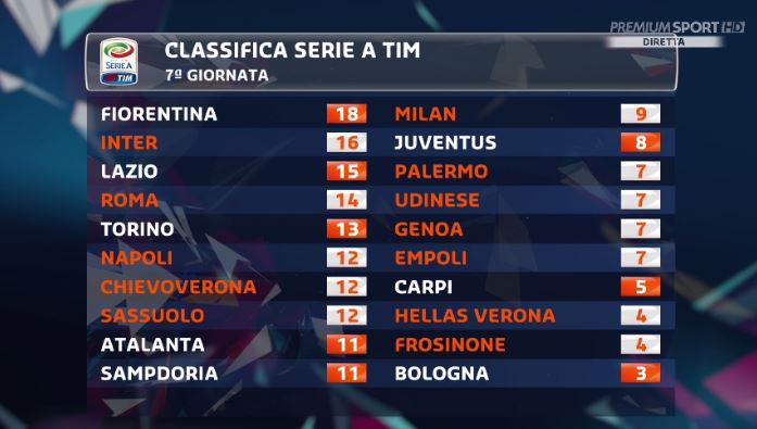 Dopo le vittorie di Fiorentina e Napoli, ecco come cambia la classifica di serie A dopo il settimo turno.
