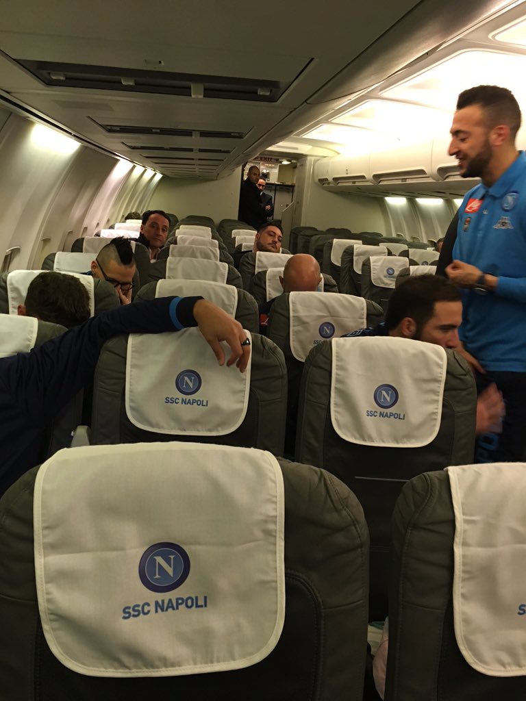 Nell'immagine pubblicata su Twitter dal magazziniere del Napoli, Tommaso Starace, ecco gli azzurri in aereo dopo la vittoria sul Palermo.
