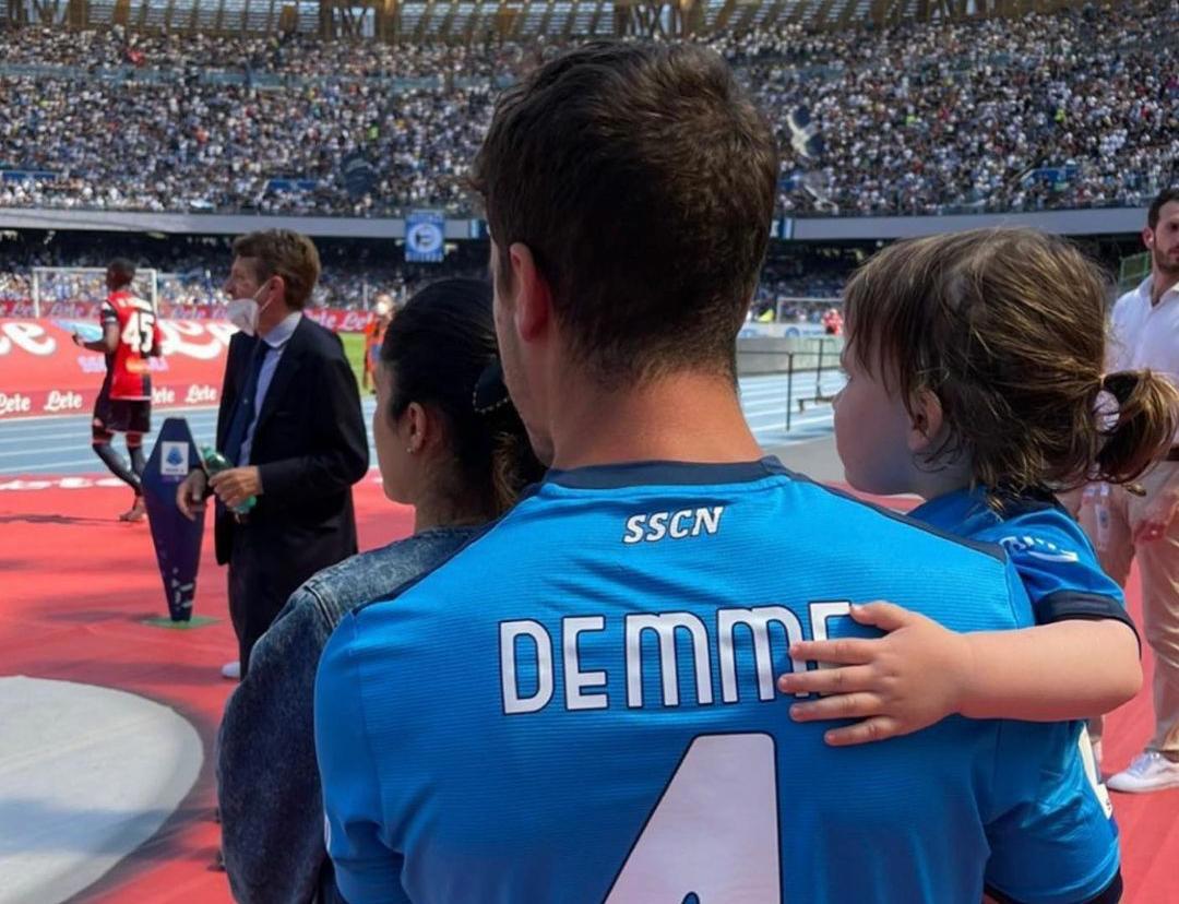 Napoli-Genoa, il centrocampista azzurro Diego Demme in campo al Maradona con sua figlia, prima del match. Di seguito lo scatto condiviso su Instagram.