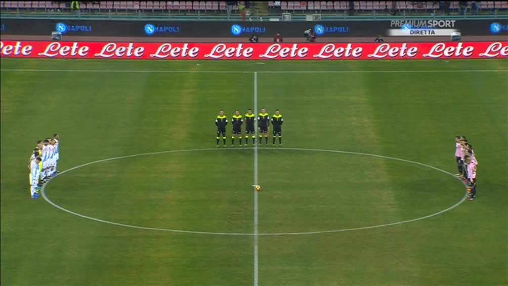 Prima del fischio d'inizio di Napoli-Palermo, è stato osservato allo stadio San Paolo un minuto di silenzio per le vittime della tragedia di Rigopiano e le persone colpite dal terremoto. Ecco una foto pubblicata su Twitter da Premium Sport.