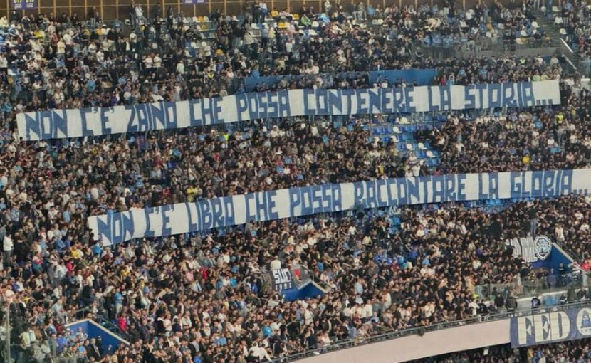 Ecco la foto di "Napoli Magazine" sullo striscione esposto dai tifosi del Napoli, in Curva B, in occasione del match contro il Monza: "Non c'è zaino che possa contenere la storia... Non c'è libro che possa raccontare la gloria...".