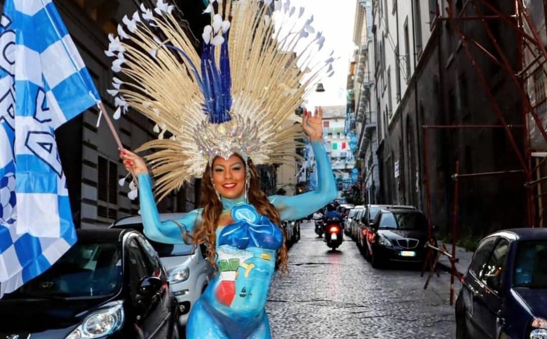 NAPOLI - Body painting per la ballerina brasiliana Simona Furacao, per celebrare lo Scudetto vinto dal Napoli. Di seguito la foto di "Napoli Magazine".