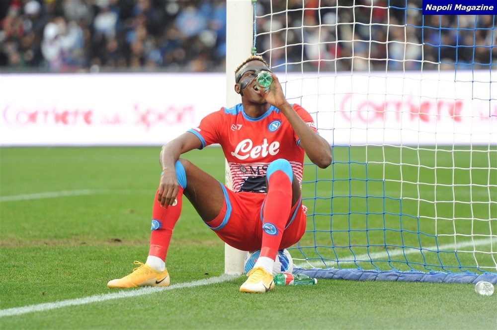 Ecco le foto di "Napoli Magazine" riguardo Victor Osimhen. L'attaccante del Napoli, in attesa della ripresa del gioco nel match casalingo contro l'Udinese, si è seduto sul pallone per bere e recuperare energie.