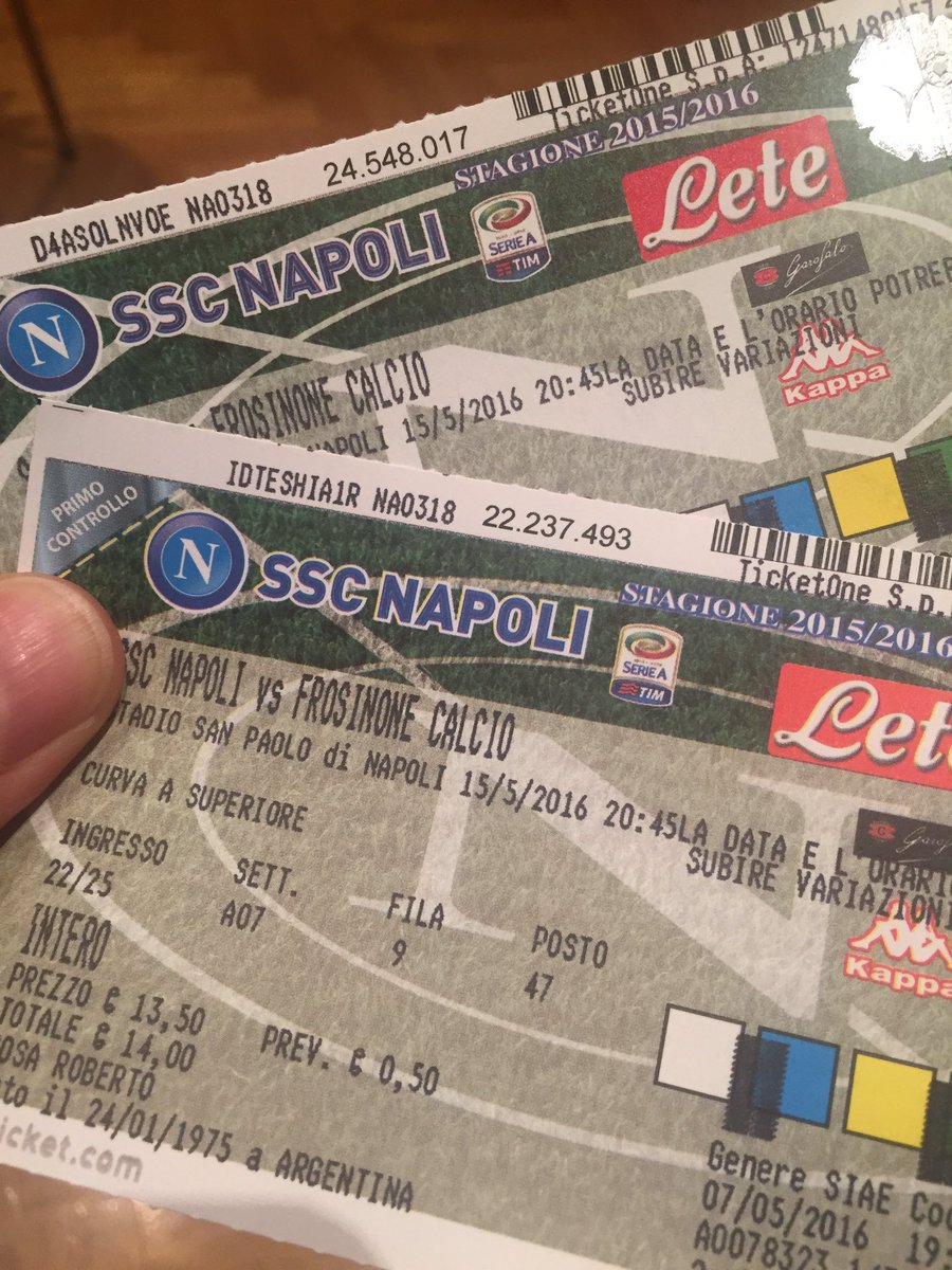 "33 pipite d'oro top, vince 2-1 il Napoli, sabato col Frosinone già in B per il secondo posto, tutti allo stadio", scrive su Twitter l'ex azzurro Roberto Sosa pubblicando la seguente foto in cui mostra i biglietti per assistere all'ultima gara di campionato del Napoli contro il Frosinone al San Paolo.