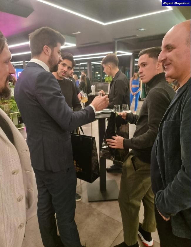 NAPOLI - Antonio Petrazzuolo, direttore di "Napoli Magazine", con Giovanni Simeone, Mario Rui, Giacomo Raspadori e Giovanni Di Lorenzo a margine di un evento a Napoli al Gold Tower Hotel.