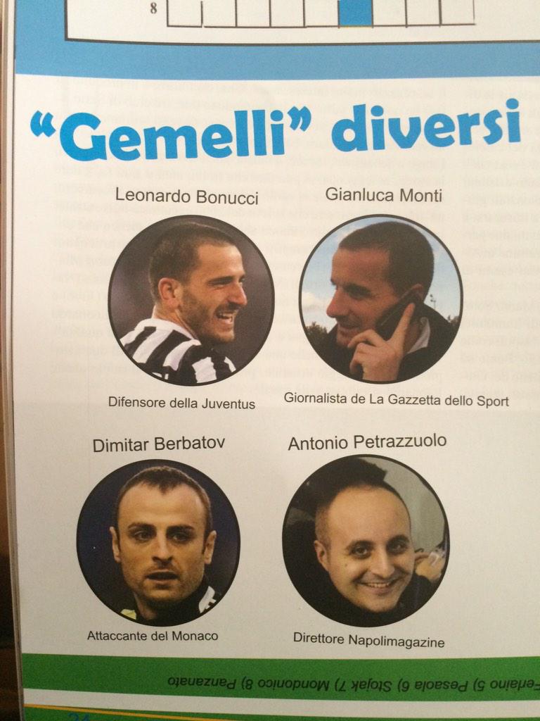 "Sul mensile "È azzurro" hanno trovato il mio gemello #Berbatov #ForzaNapoliSempre", scrive su Twitter e Instagram il direttore di "Napoli Magazine", Antonio Petrazzuolo, pubblicando la pagina del mensile "E' azzurro". Nella foto anche Monti paragonato a Bonucci.