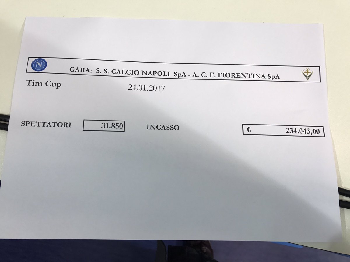 In occasione di Napoli-Fiorentina (1-0), Quarti di finale di Coppa Italia, c'erano al San Paolo 31.850 spettatori per un incasso totale di 234.043,00 euro.
