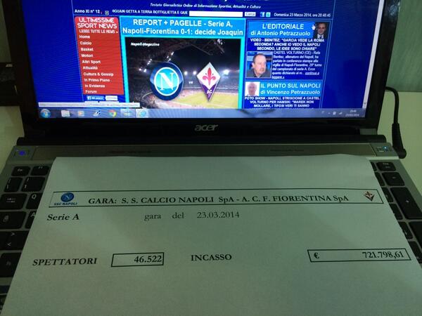 NAPOLI - In occasione di Napoli-Fiorentina 0-1, 29° turno del campionato di serie A, c'erano al San Paolo 46.522 spettatori per un incasso totale di 721.798,61 euro. Ecco il dato ufficiale.