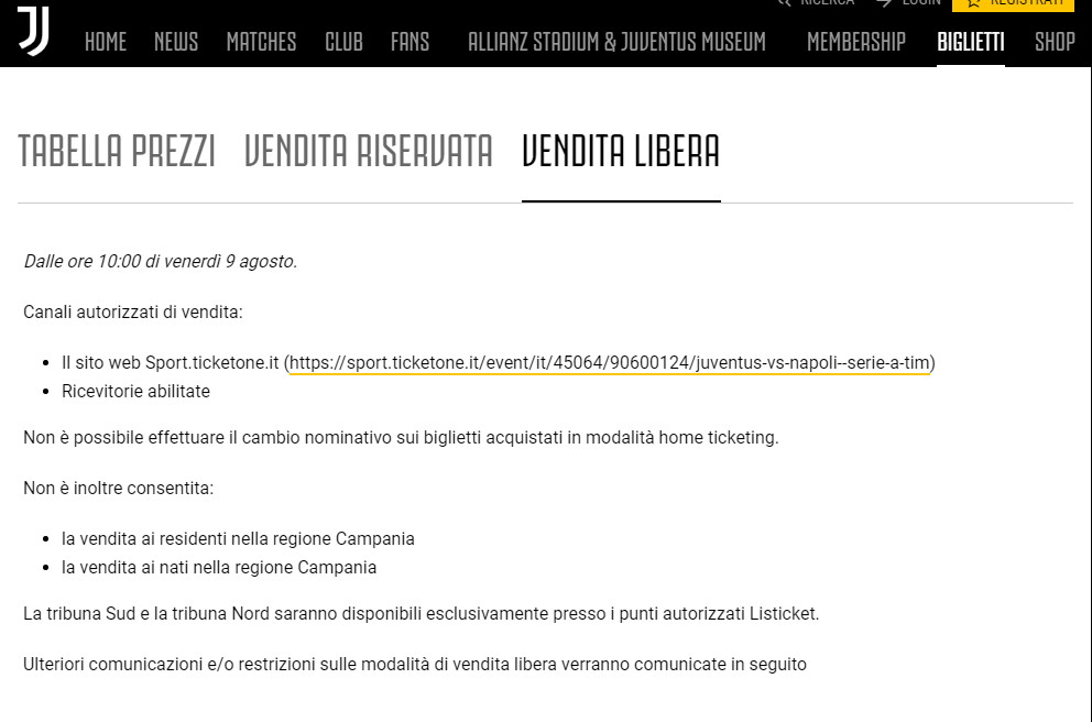 Come riportato da Repubblica e come si legge sul sito ufficiale bianconero, la vendita dei biglietti per Juventus-Napoli è vietata non solo ai residenti in Campania, ma anche a chi è nato nella Regione campana. La Juventus ha spiegato che è stata una misura concordata con Questura e Osservatorio: una sorta di prevenzione in attesa che l’Osservatorio dirami le proprie disposizioni.