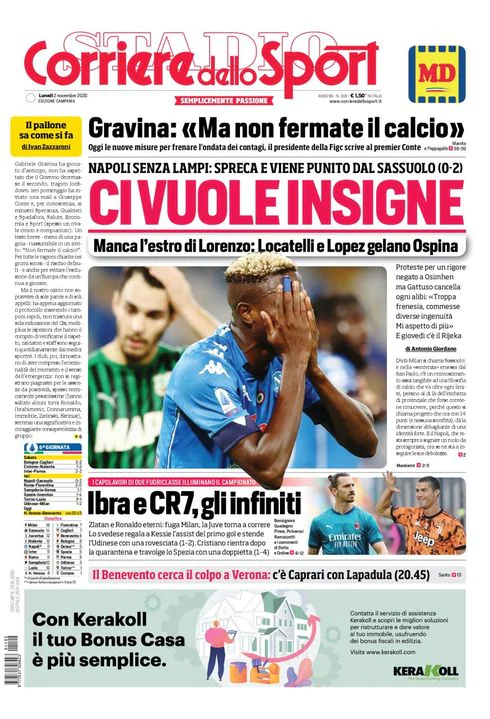 Il Corriere dello Sport, nella sua edizione Campania, apre la prima pagina con un titolo sul Napoli, dopo la sconfitta con il Sassuolo: "Ci vuole Insigne. Napoli senza lampi: spreca e viene punito dal Sassuolo. Manca l'estro di Lorenzo: Locatelli e Lopez, gelano Ospina". Ancora Coronavirus: "Non fermate il calcio", dice Gravina. Oggi le nuove misure per fermare l'ondata di contagi.