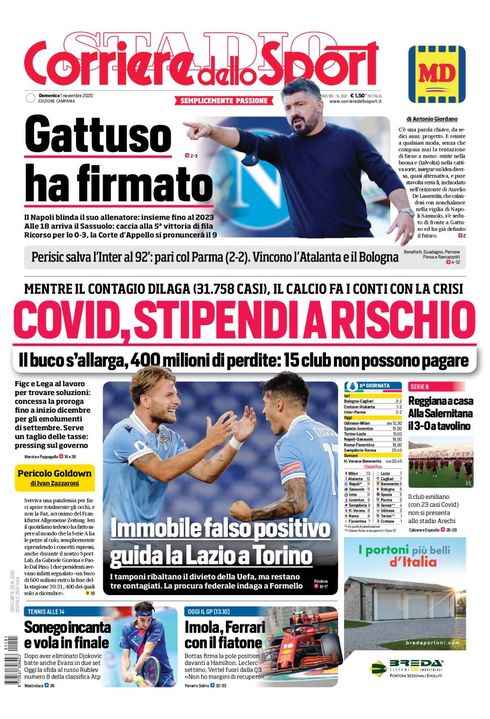Il Corriere dello Sport, nella sua edizione Campania, apre la prima pagina con un titolo dedicato a Gattuso e al rinnovo di contratto con il Napoli: "Gattuso ha firmato. Il Napoli blinda il suo allenatore: insieme fino al 2023. Alle 18:00 arriva il Sassuolo, caccia alla quinta vittoria di fila". Sempre vivo il tema Coronavirus: "Covid, stipendi a rischio. Il calcio fa i conti con la crisi: 400 milioni di perdite. 15 club non possono pagare".