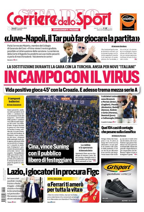 Il Corriere dello Sport, nella sua edizione Campania, apre con un titolo sulla vicenda Juve-Napoli: "Juve-Napoli, il Tar può far giocare la partita". Parla l'avvocato Maietta, membro del Collegio di garanzia del Coni: "La sentenza della Corte d'Appello ha prodotto delle accuse molto pesanti, si parla di macchinazione. Valuteremo le carte".