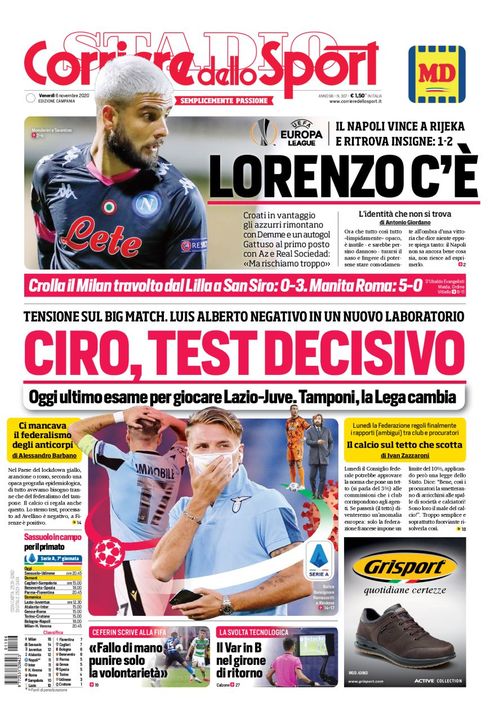 Il Corriere dello Sport, nella sua edizione Campania, apre la prima pagina con un titolo sul Napoli: "Napoli, Lorenzo c'è! Il Napoli vince a Rijeka e ritrova Insigne: 1-2". Milan sconfitto in Europa League: "Crolla il Milan, travolto dal Lille a San Siro". "Manita Roma: 5-0".