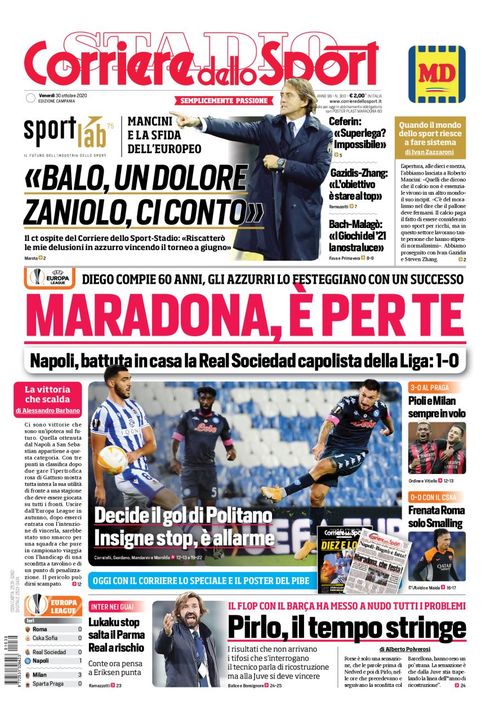 Il Corriere dello Sport, nella sua edizione Campania, apre la sua prima pagina con un titolo dedicato al Napoli e a Diego Armando Maradona: "Maradona, è per te. Diego compie 60 anni, gli azzurri lo festeggiano con un successo. Napoli, battuta in casa la Real Sociedad, capolista della Liga. Decide il gol di Politano, Insigne stop, è allarme".