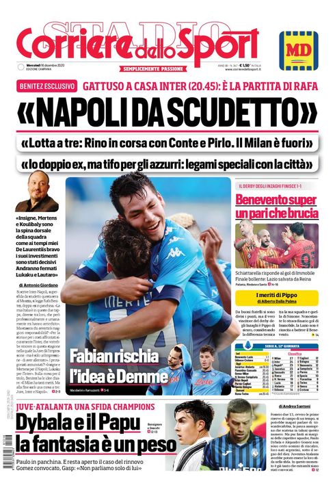 Il Corriere dello Sport, nella sua edizione Campania, apre la prima pagina con un titolo sul Napoli: "Napoli da scudetto. Intervista esclusiva di Benitez al quotidiano. Lotta a tre per il titolo: Rino in corsa con Conte e Pirlo. Il Milan è fuori". Benitez doppio ex: "Io doppio ex ma tifo per gli azzurrì: legami speciali con la città".