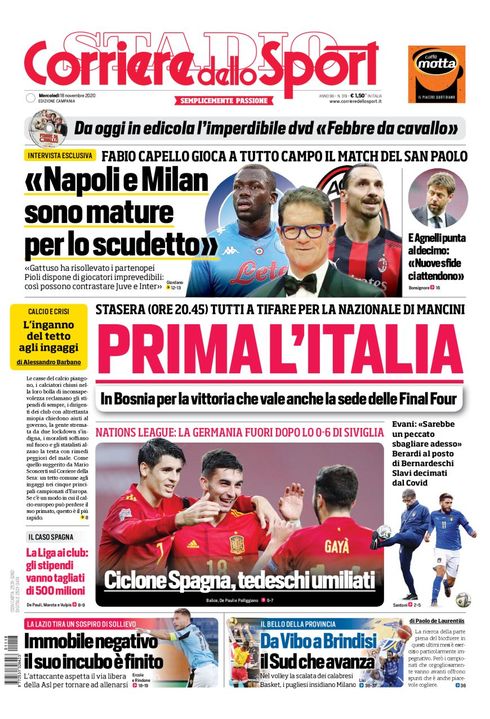 Il Corriere dello Sport, nella sua edizione Campania, apre la prima pagina con un titolo su Napoli-Milan, prossimo big match del campionato di Serie A: "Napoli e Milan sono mature per lo scudetto", parola di Fabio Capello che gioca a tutto campo il match del San Paolo."Gattuso ha risollevato i partenopei. Pioli dispone di giocatori imprevedibili. Possono contrastare Juve e Inter". Spazio anche alla Nazionale: "Prima l'Italia. Stasera tutti a tifare per la Nazionale di Mancini. In Bosnia per la vittoria che vale anche la sede delle Final Four".