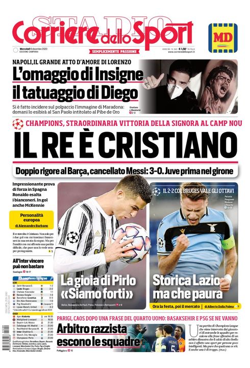 La prima pagina del Corriere dello Sport edizione Campania, si concentra sul grande atto d'amore di Lorenzo Insigne per Diego Armando Maradona: "Napoli, il grande atto d'amore di Lorenzo. L'omaggio di Insigne, il tatuaggio dedicato a Diego. Si è fatto incidere sul polpaccio l'immagine di Maradona. Domani lo esibirà al San Paolo intitolato al Pibe de Oro".