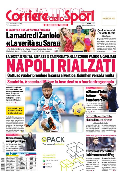 Il Corriere dello Sport, nella sua edizione Campania, apre la sua prima pagina con un titolo sul Napoli in vista del match con il Cagliari: "Napoli rialzati. La sosta è finita, riparte il campionato: gli azzurri vanno a Cagliari. Gattuso vuole riprendere la corsa al vertice. Osimhen verso la multa. Scudettom è caccia al Milan: la Juve dentro o fuori entro gennaio".