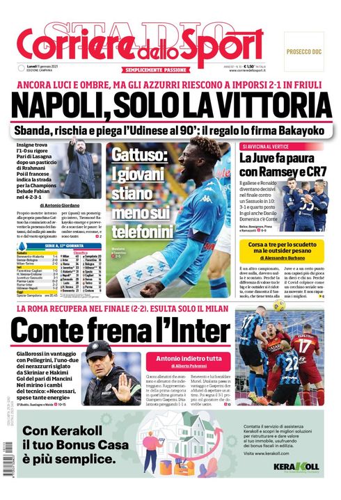 Il Corriere dello Sport, nella sua edizione Campania, apre così la sua prima pagina dopo la vittoria del Napoli in extremis sull'Udinese di Gotti: "Napoli, solo la vittoria. Ancora luci e ombre, ma gli azzurri riescono ad imporsi 2-1 in Friuli. Sbanda, rischia e piega l'Udinese al 90': il regalo lo firma Bakayoko". Gattuso: "I giovani stiano meno sui telefonini".