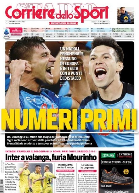 Il Corriere dello Sport, edizione Campania, dedica spazio al Napoli in prima pagina: "Numeri Primi. Un Napoli fenomenale: nessuno in Europa è in testa con 8 punti di distacco".
