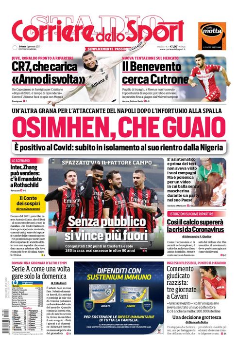 "Osimhen, che guaio", questo il titolo principale della prima pagina del quotidiano Corriere dello Sport, edizione Campania. Il Corriere dello Sport si sofferma sul caso Osimhen: "Un'altra grana per l'attaccante del Napoli dopo l'infortunio alla spalla. E' positivo al Covid-19: subito in isolamento al suo rientro dalla Nigeria".