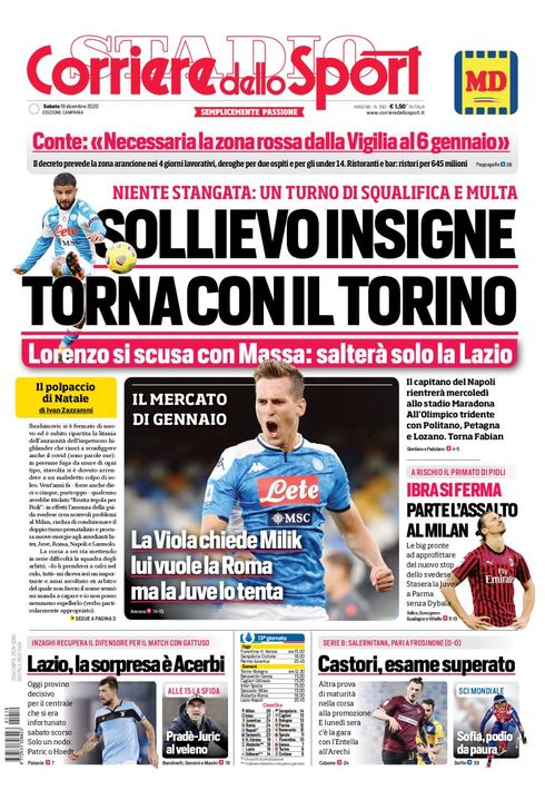 Il Corriere dello Sport, nella sua edizione Campania, apre la prima pagina con un titolo su Lorenzo Insigne, capitano del Napoli: "Sollievo Insigne, torna con il Torino. Niente stangata: un turno di squalifica e multa. Lorenzo si scusa con Massa, salterà solo la Lazio".