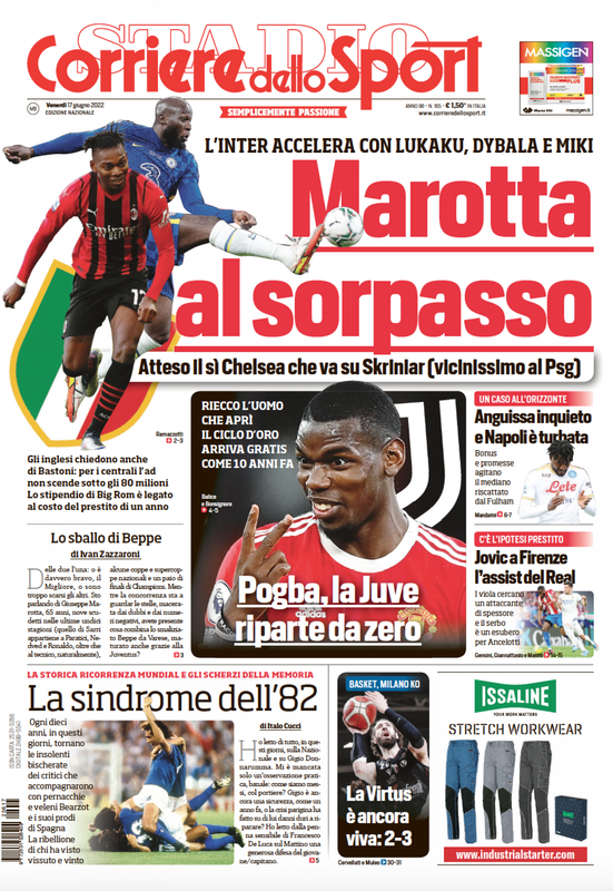 Il Corriere dello Sport apre in prima pagina con il mercato dell'Inter: "Marotta al sorpasso". In taglio centrale spazio alla Juventus: "Pogba, la Juve riparte da zero", mentre in spalla spazio al Napoli "Anguissa inquieto e Napoli turbata" e alla Fiorentina: "Jovic a Firenze".