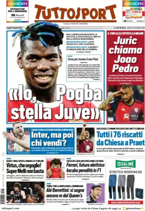 "Io, Pogba stella Juve" il titolo in primo piano di Tuttosport, che riprende le parole del centrocampista francese sul suo futuro bianconero. In spalla spazio al Torino: "Juric chiama Joao Pedro". In taglio centrale sempre mercato: "Inter, ma poi chi vendi?" e un riferimento ai prestiti in scadenza "Tutti i 76 riscatti da Chiesa a Praet".