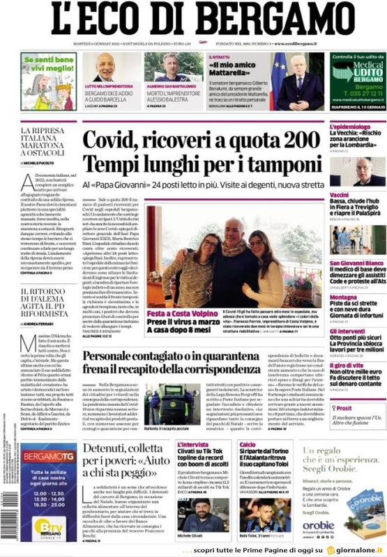 "Si riparte dal Torino e l'Atalanta ritrova il suo capitano Toloi". Titola così in taglio basso l'Eco di Bergamo nell'avvicinamento alla sfida tra Gasperini e Juric di giovedì pomeriggio.